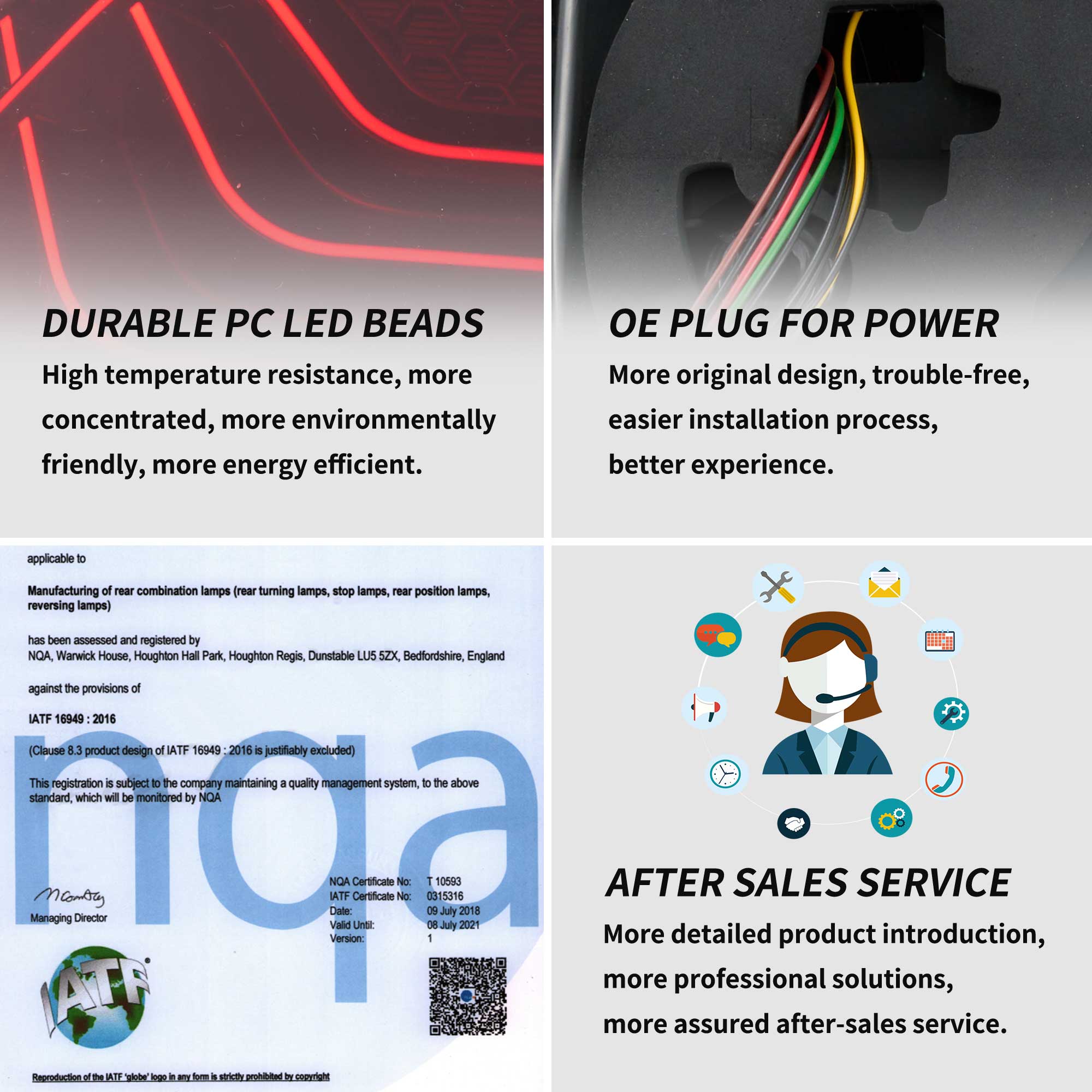 Our factory has American DOT, European E-Mark and Chinese CCC certification to assure product quality. In terms of appearance, we have appearance and design patents of our car lights. As for production capacity, our factory has IATF 16949 auto parts production management system and ISO 9001 quality management system certification standards.