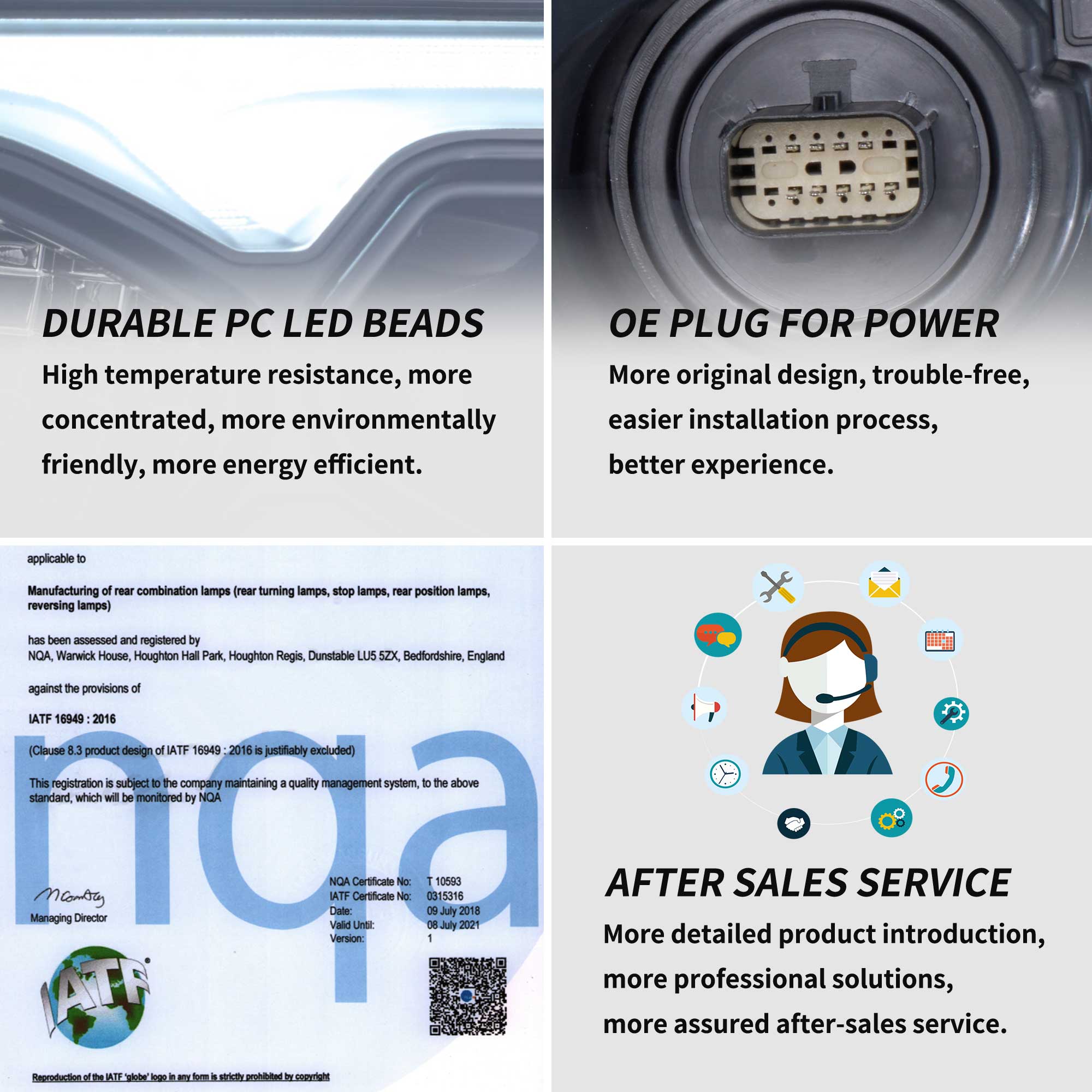 Our factory has American DOT, European E-Mark and Chinese CCC certification to assure product quality. In terms of appearance, we have the appearance and design patents of our car lights. As for production capacity, our factory has IATF 16949 auto parts production management system and ISO 9001 quality management system certification standards.